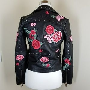 Quality zippers on front and pockets and a buckle belt as well. BELLE VER 100 Genuine leather rose embroidered motorcycle style jacket with stud detail - Size S. Soft and buttery yet weighty this authentic motorcycle jacket is built to withstand weather conditions and protect the wearer.