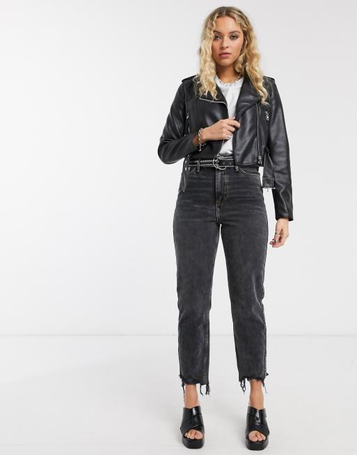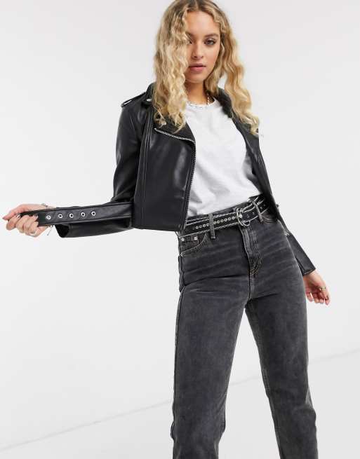 Bershka Cropped Faux Leather Biker Jacket In Black Asos Faux Leather Biker Jacket Biker Jacket Outfit Leather Jackets Women