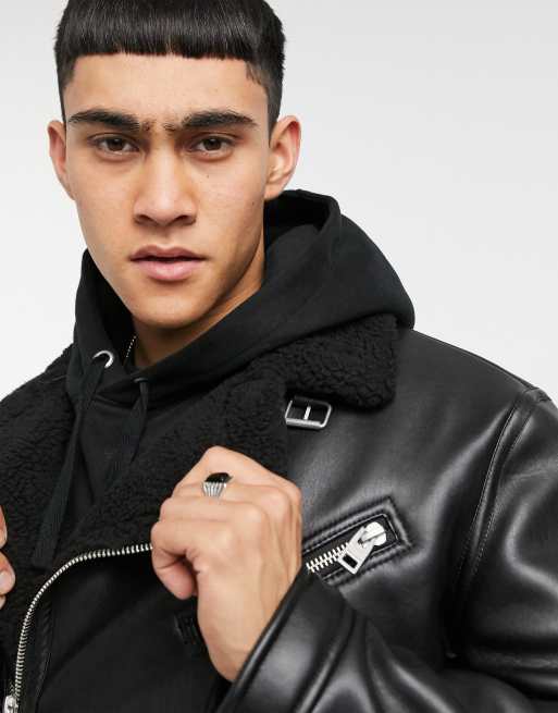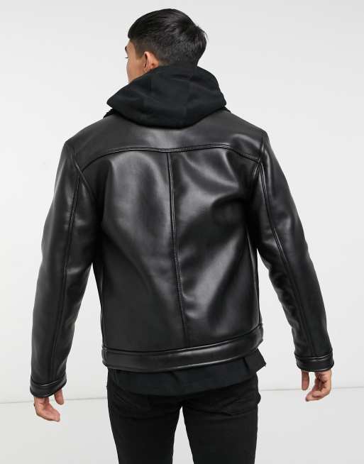 Bershka Faux Leather Biker Jacket With Borg Collar In Black Asos